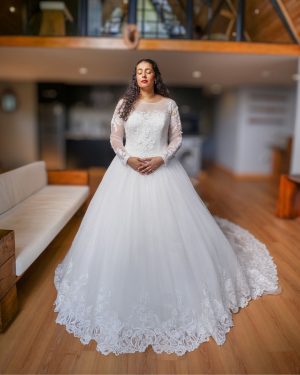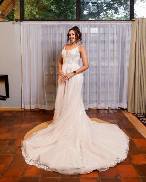 Don’t miss | Designed with soft off-shoulder straps and delicate illusion detailing, the gown flows effortlessly into a fit-and-flare skirt. |